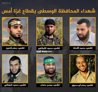 والشهداء الستة هم: "الشهيد طاهر عصام شاهين 29 عاماً، الشهيد وسام أحمد أبو محروق 37 عاماً، الشهيد موسى إبراهيم سلمان 30 عام، الشهيد محمود وليد الأستاذ 34 عاماً، الشهيد محمود محمد الطواشي 27 عاماً من سكان دير البلح، والشهيد محمود سعيد حلمي القيشاوي 27 عاماً" من سكان مدينة غزة.