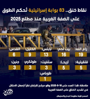 إنفوغراف: نقاط خنق.. 83 بوابة إسرائيلية تُحكم الطوق على الضفة الغربية منذ مطلع 2025