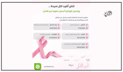 صدى نيوز - في إطار التزامه العميق بدعم صحة المرأة والمساهمة الفاعلة في خدمة المجتمع، ينفذ بنك القدس، بالتعاون مع مستشفى المطلع، حملة الفحص المبكر لسرطان الثدي عبر العيادة المتنقلة، التي ستجوب عدة مدن ومحافظات خلال شهر أكتوبر، وتُتيح الخدمة مجانا أمام فروع البنك في نقاط استهداف مختارة.