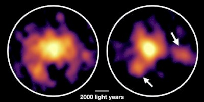 لكن "المجرة الوحشية"، تحتوي على 3 نوى أو قلوب، أو بالأحرى اثنين من النوى موجودة على بعد عدة سنوات ضوئية من النواة الأساسية التي تشكل المركز، لكل منهما ستار وسحابته الممتدة الخاصة به.