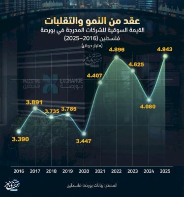 عقد من النمو والتقلبات: القيمة السوقية للشركات المدرجة في بورصة فلسطين (2016- 2025)
