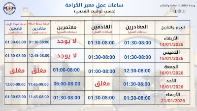 صدى نيوز: أعلنت الهيئة العامة للمعابر والحدود عن ساعات عمل المعابر خلال الأيام القليلة القادمة.