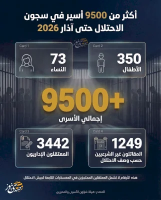 أكثر من 9500 أسير في سجون الاحتلال حتى آذار 2026
