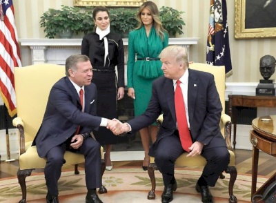 وأكد ترامب أن إدارته ملتزمة تقوية العلاقات مع الأردن، معتبراً أنه يعمل بجد شديد لتحقيق السلام بين الفلسطينيين وإسرائيل، كما وصف العاهل الأردني بـ»المحارب الشجاع والضيف الكريم».