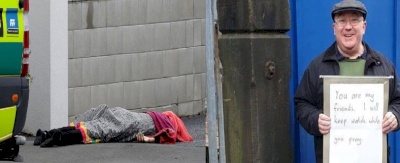 وكتب الرجل البالغ من العمر 57 عاماً رسالة على لافتة ورقية وذهب بها لملاقاة المصلين خارج المسجد. وفي رسالته كتب جرايستون: "أنتم أصدقائي وأنا سأراقب المكان أثناء الصلاة".