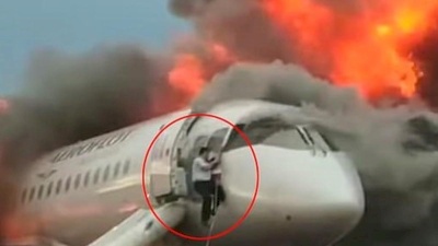 وأوضح الفيديو الطيار المساعد Maxm Kuznetsov، البالغ من العمر 36 عاما، وهو يفر من قمرة القيادة بعد لحظات من الهبوط الاضطراري لطائرة الايروفلوت، سوخوي سوبر جيت-100، يوم الأحد، بعد اشتعال النار فيها، ومن ثم عاد وتسلق المساعد حبل السلامة مرتديا سترة واقية، في موقف بطولي لإنقاذ زميله القبطان في مطار شيريميتيفو بالعاصمة الروسية.