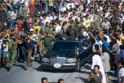 تدافعت الحشود من كل الجهات على 'أبو عمار' .. وكانت الطريق مزدانة بالأعلام الفلسطينية وبصور عملاقة للرئيس عرفات.