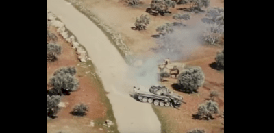ونشر النشطاء شريط الفيديو المصور من الجو، بشكل مكثف حيث تظهر بالفيديو المطاردة الهوليودية بين الدبابة سورية والمدرعة التركية في ريف إدلب.
