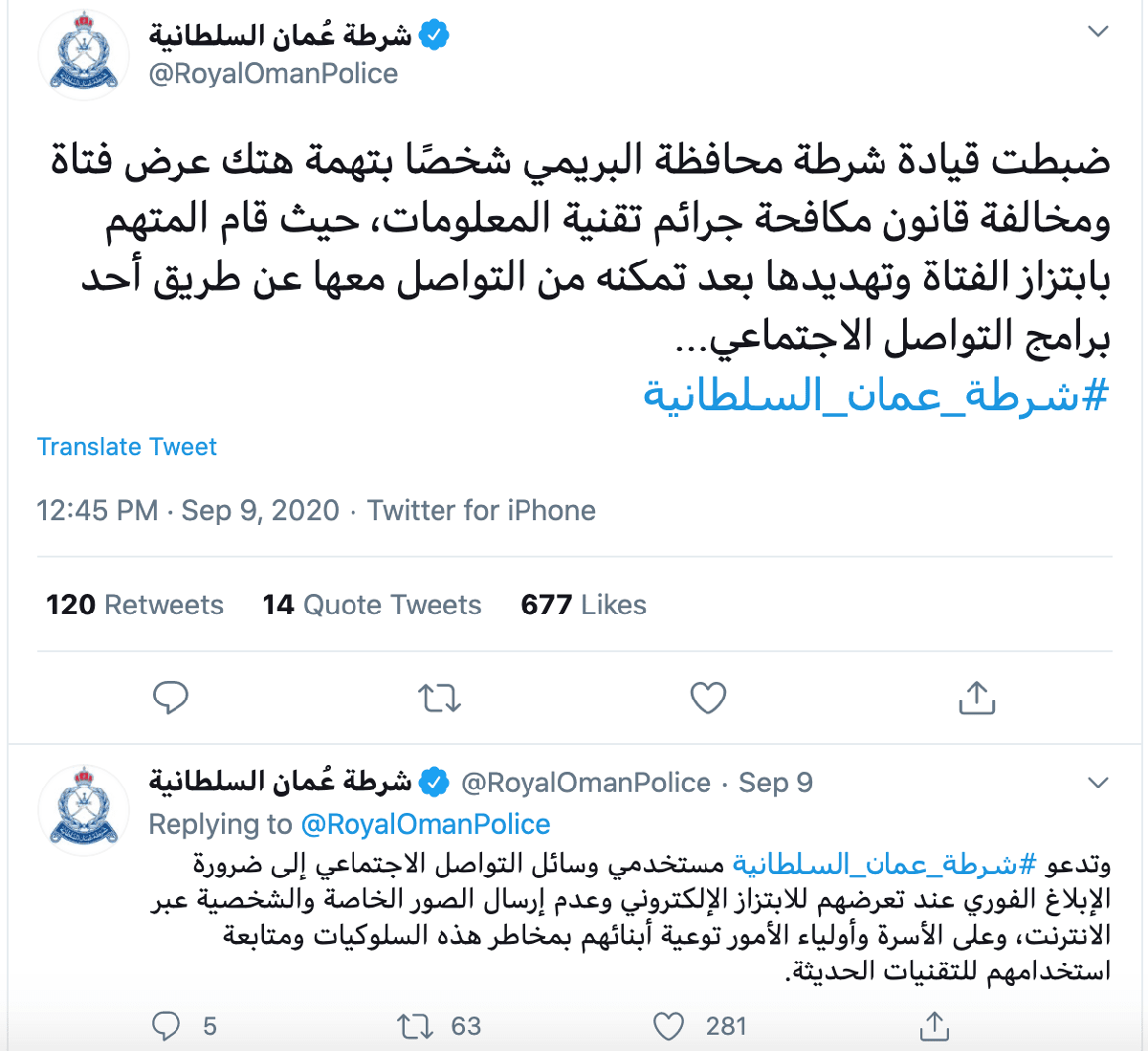 وذكر البيان الذي أوردته شرطة عمان على صفحتها الرسمية بـ(تويتر) أن المتهم قام بابتزاز فتاة وتهديدها بعد تمكنه من التواصل معها عن طريق أحد برامج التواصل الاجتماعي.