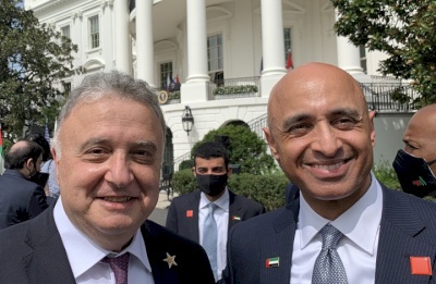ونشر السفير الإسرائيلي في ألمانيا جيرمي إيسخاروف صورتين له مع السفير الإماراتي في واشنطن، يوسف العتيبة، خلال حفل توقيع اتفاق التطبيع، الأولى بكمامة والأخرى بدون، معلقا: " في هذا اليوم بعد سنوات عديدة من الصداقة والاتصالات السرية، يمكنني التقاط صورة مع صديقي العزيز يوسف العتيبة بدون أقنعة".