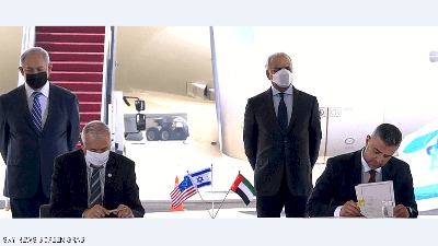 صدى نيوز: وقعت إسرائيل والإمارات، اليوم الثلاثاء، سلسلة اتفاقيات مشتركة برعاية أميركية، للتعاون المشترك في عدة مجالات منها الطيران والاستثمارات والعلوم والتكنولوجيا، واتفاقية خاصة لإعفاء "زوار مواطني الدولتين" من تأشيرة الدخول لكليهما.