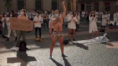 صدى نيوز - نشرت وكالة اسوشيتد برس فيديو من مدينة برشلونة الإسبانية يظهر مظاهرة أطباء المدينة وبعضهم في ملابس داخلية فقط وهم يحتجون على قلة الراحة وتدني الرواتب وقلة الإشراف وسط انتشار كورونا.
