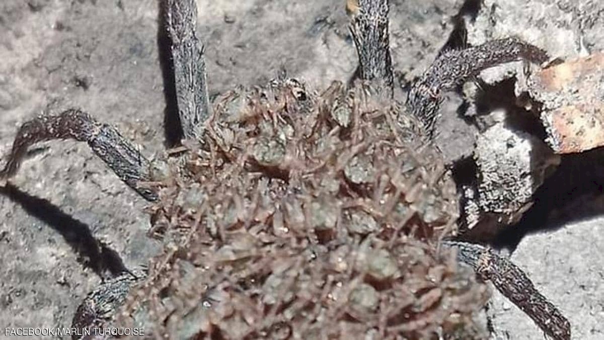 وتظهر الصورة المخيفة، أحد سائقي الأدغال من فيكتوريا بأستراليا، أنثى عنكبوت الذئب وهي تحمل عددا كبيرا من صغارها على ظهرها