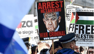 وطبعت على إحدى اللافتات صورة نتنياهو وكتب عليها "مطلوب بسبب ارتكابه جرائم ضد الإنسانية وقتل الشعب الفلسطيني"، وعلى لافتة أخرى كتب "نعم لإخراج الصهيونية من فلسطين، نعم لعزل نتنياهو".