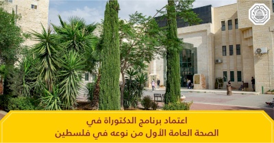 صدى نيوز - حصل برنامج الدكتوراه في "الصحة العامة" في جامعة القدس على اعتماد الهيئة الوطنية للاعتماد والجودة والنوعية في وزارة التعليم العالي والبحث العلمي الفلسطينية، وذلك استعدادًا لطرحه رسميًا ابتداءً من العام الأكاديمي 2021/2022، باعتباره البرنامج الأول من نوعه على مستوى جامعات الوطن، لتسجل الجامعة بذلك إضافة نوعية للحقل الصحي الفلسطيني في ظل الظرف الوبائي الذي يمر به العالم.