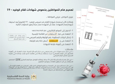 أصبح بإمكانك الآن استصدار شهادة اللقاح ضد فيروس كوفيد - 19 إلكترونياً بعد استيفاء شروط إصدار الشهادة، من خلال التسجيل على منصة كوفيد - 19 الإلكترونية على الموقع الإلكتروني: vaccine.moh.ps، علماً بأن الشهادة تصدر مجاناً وفق الخطوات التالية: