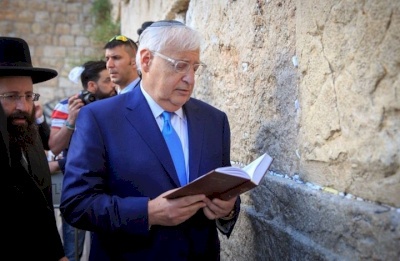 رام الله - صدى نيوز- نشرت وسائل إعلام إسرائيلية صورة يظهر فيها السفير الأمريكي لدى إسرائيل، ديفيد فريدمان (يهودي الديانة)، وهو يشارك المستوطنين أداء صوات تلمودية في ساحة حائط البراق الملاصق للمسجد الأقصى المبارك في مدينة القدس المحتلة .