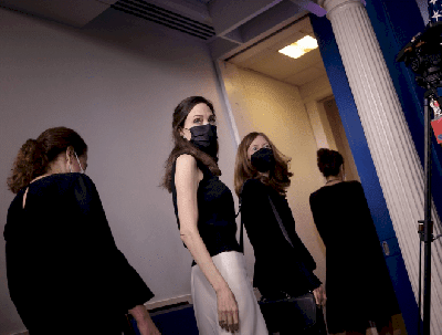 والتقت أنجلينا جولي بالسكرتيرة الصحفية للبيت الأبيض، جين بساكي، ومديرة الاتصالات، كيت بيدينغفيلد، والرئيسة المشاركة لمجلس سياسة النوع الاجتماعي بالبيت الأبيض، جينيفر كلاين.